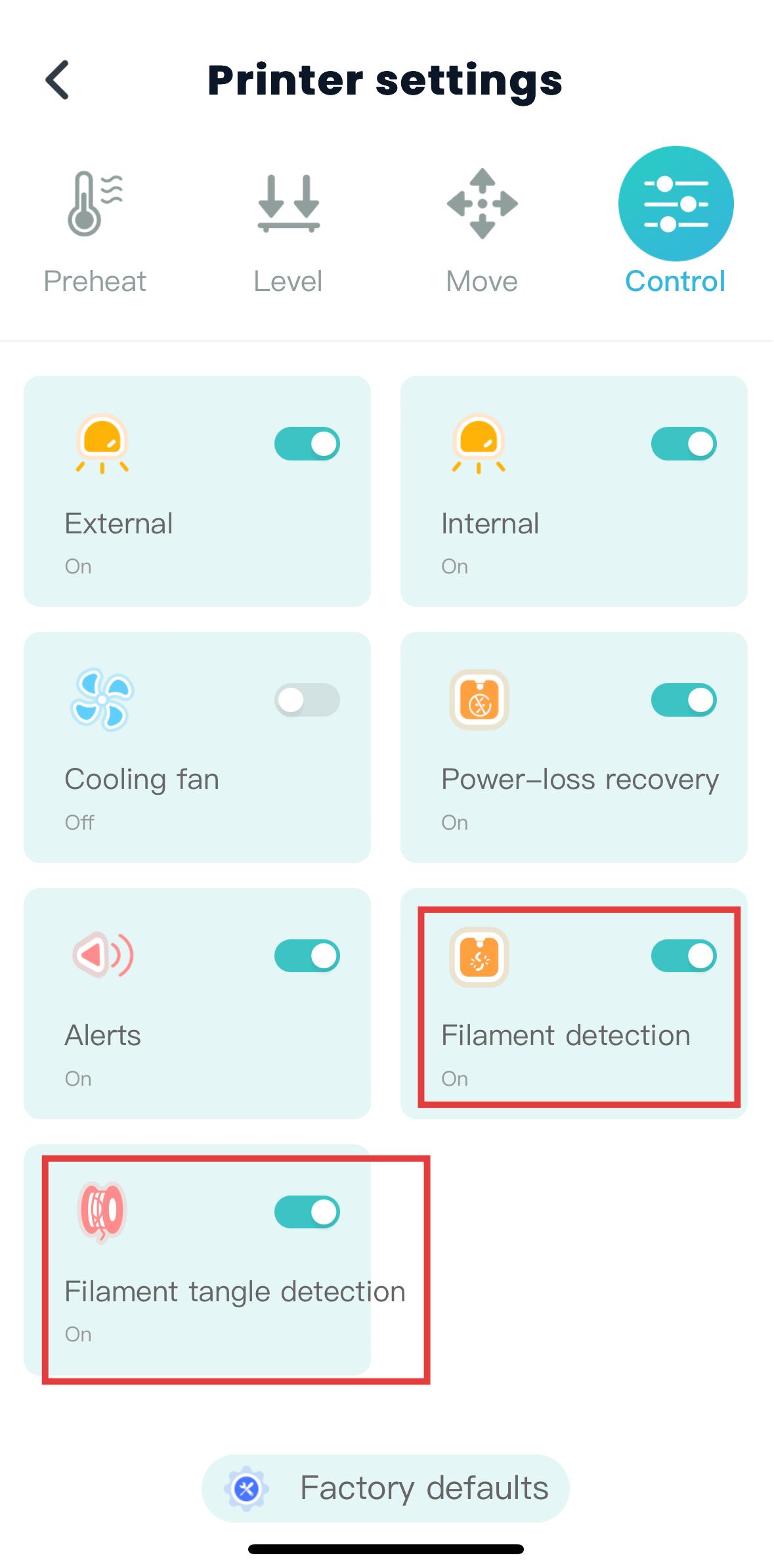 If you’d prefer not to use filament breakage or tangle alerts, you can disable them in the app printer settings.