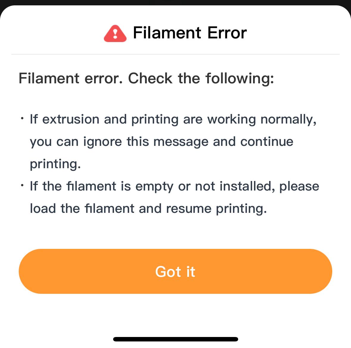 This alert may indicate one or more of the following: filament tangling, model warping, or nozzle clogging.