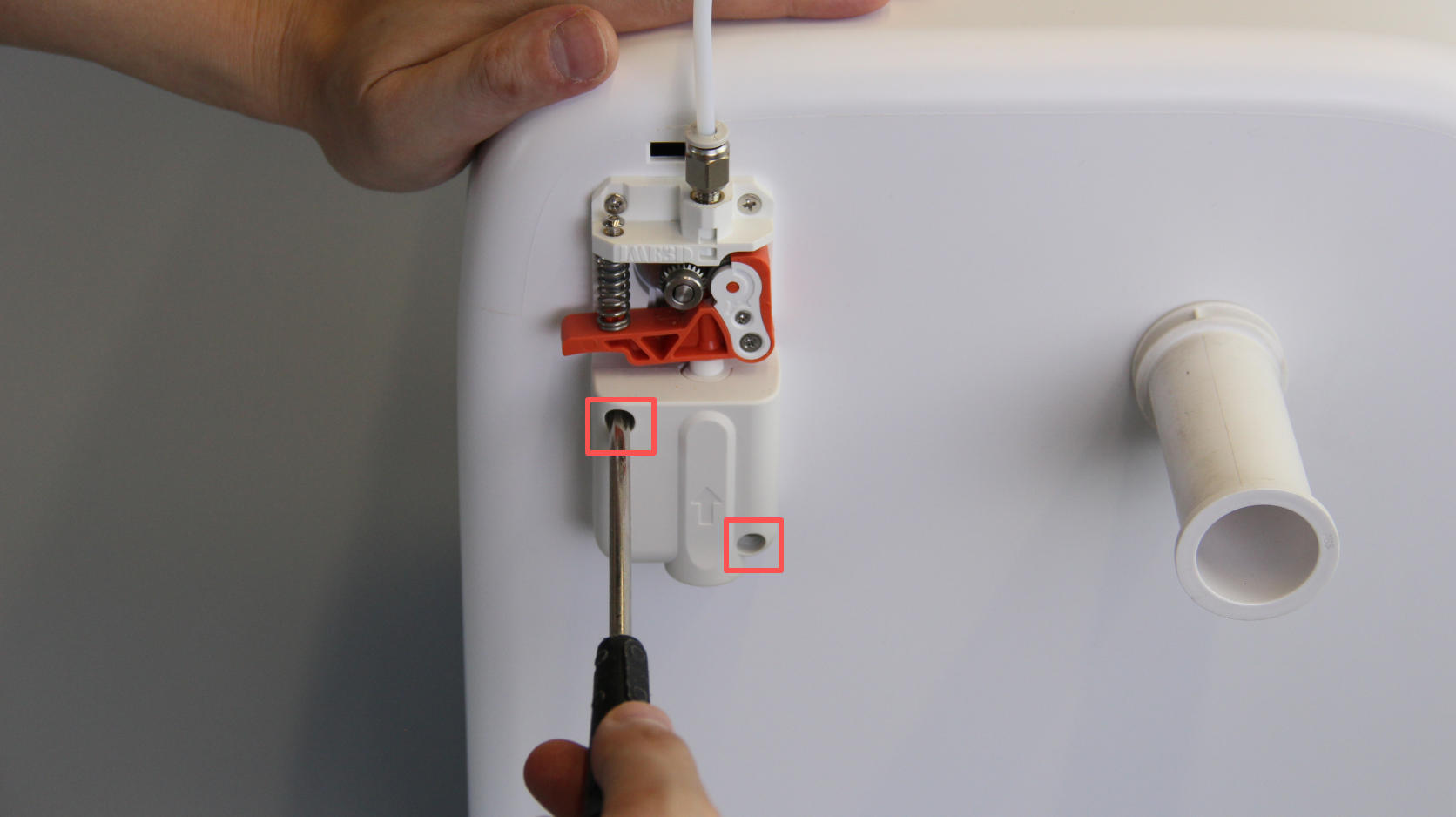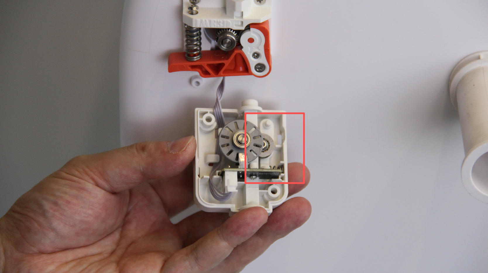 | 7. If the filament still doesn't come out easily, insert the tweezers under the white rocker arm and carefully pry it upward. | 8. Pull the filament out again from the top of the module. | 9. Reassemble the rocker arm, ensuring the spring is correctly positioned. |