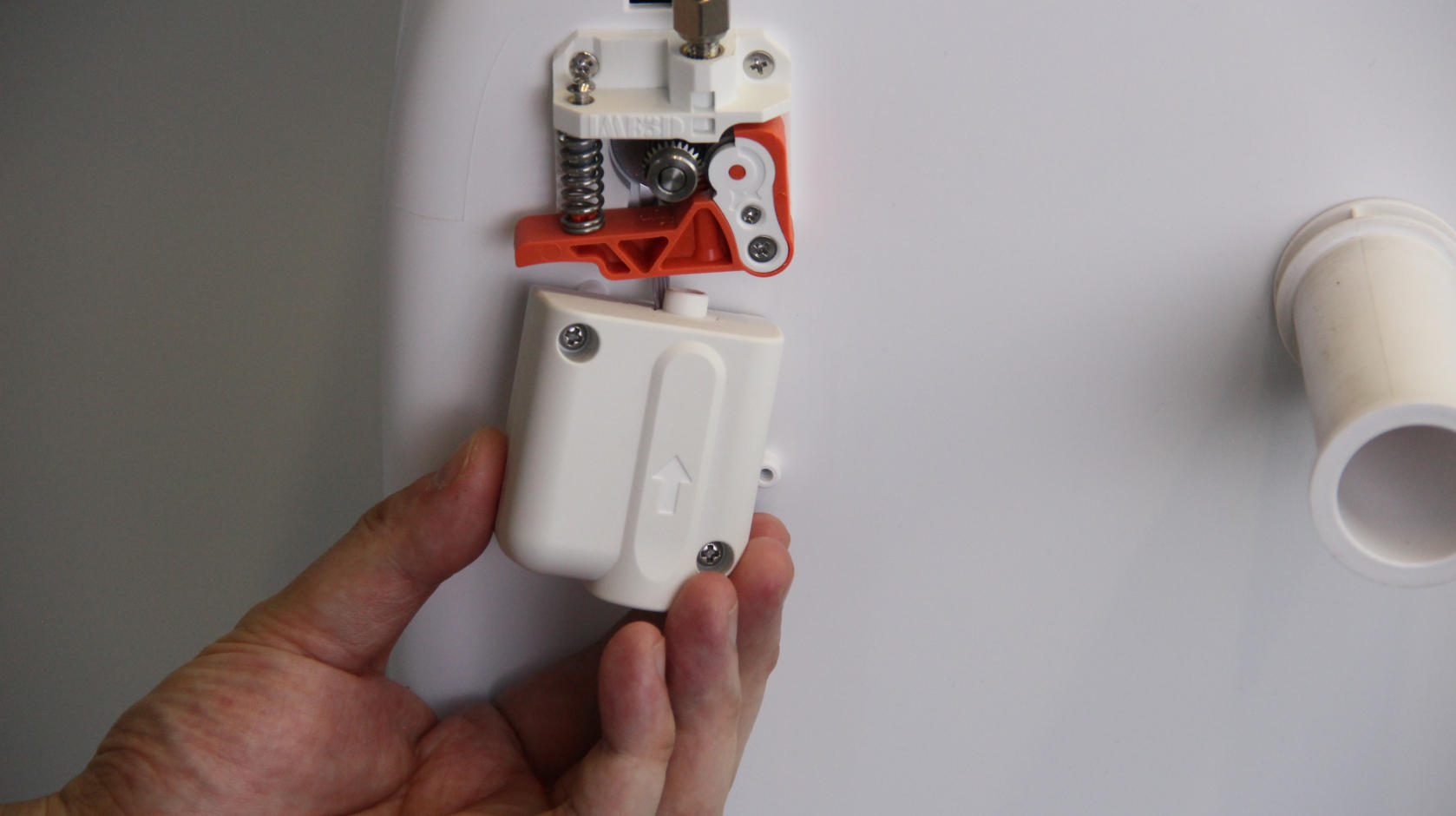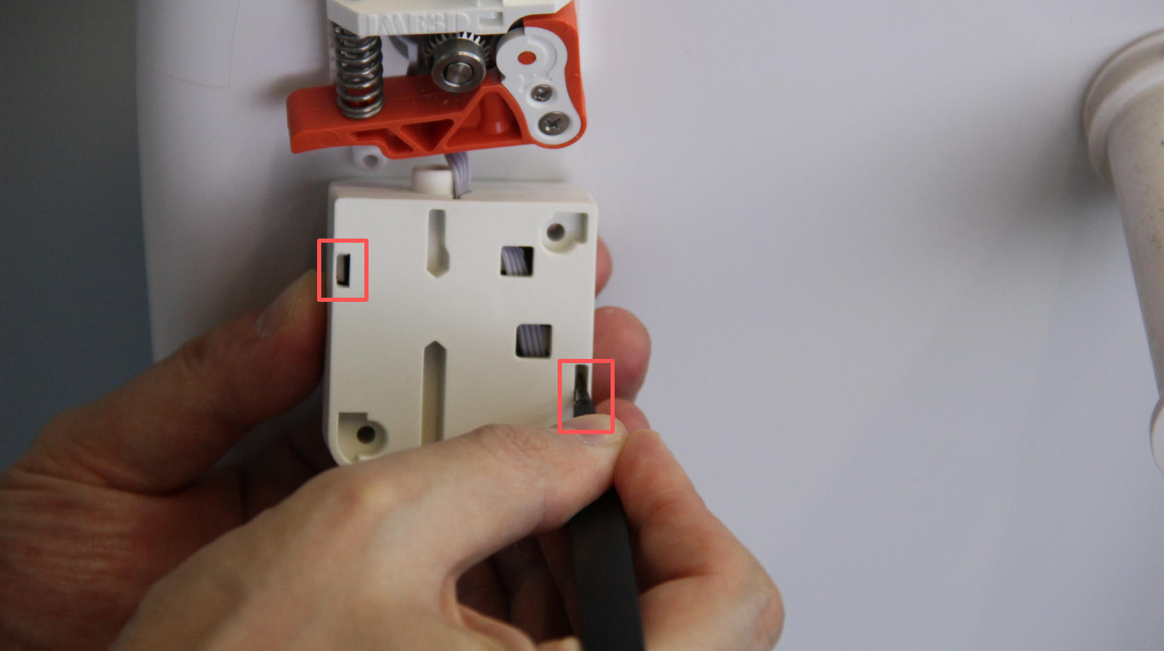 | 4. Rotate the module 180 degrees. Use tweezers to insert into the small holes at the top and bottom to release the internal clips. | 5. Open the module cover. You’ll see the filament jammed around the wheel. | 6. Use tweezers to straighten the filament tip so it can disengage from the wheel. Then pull it out from the top of the module by hand. |