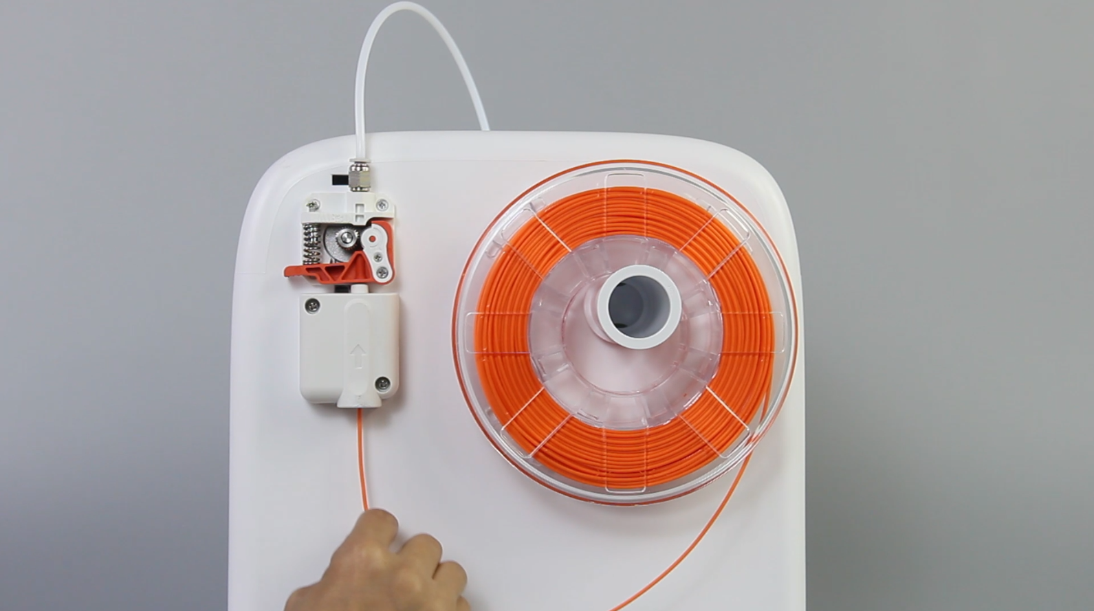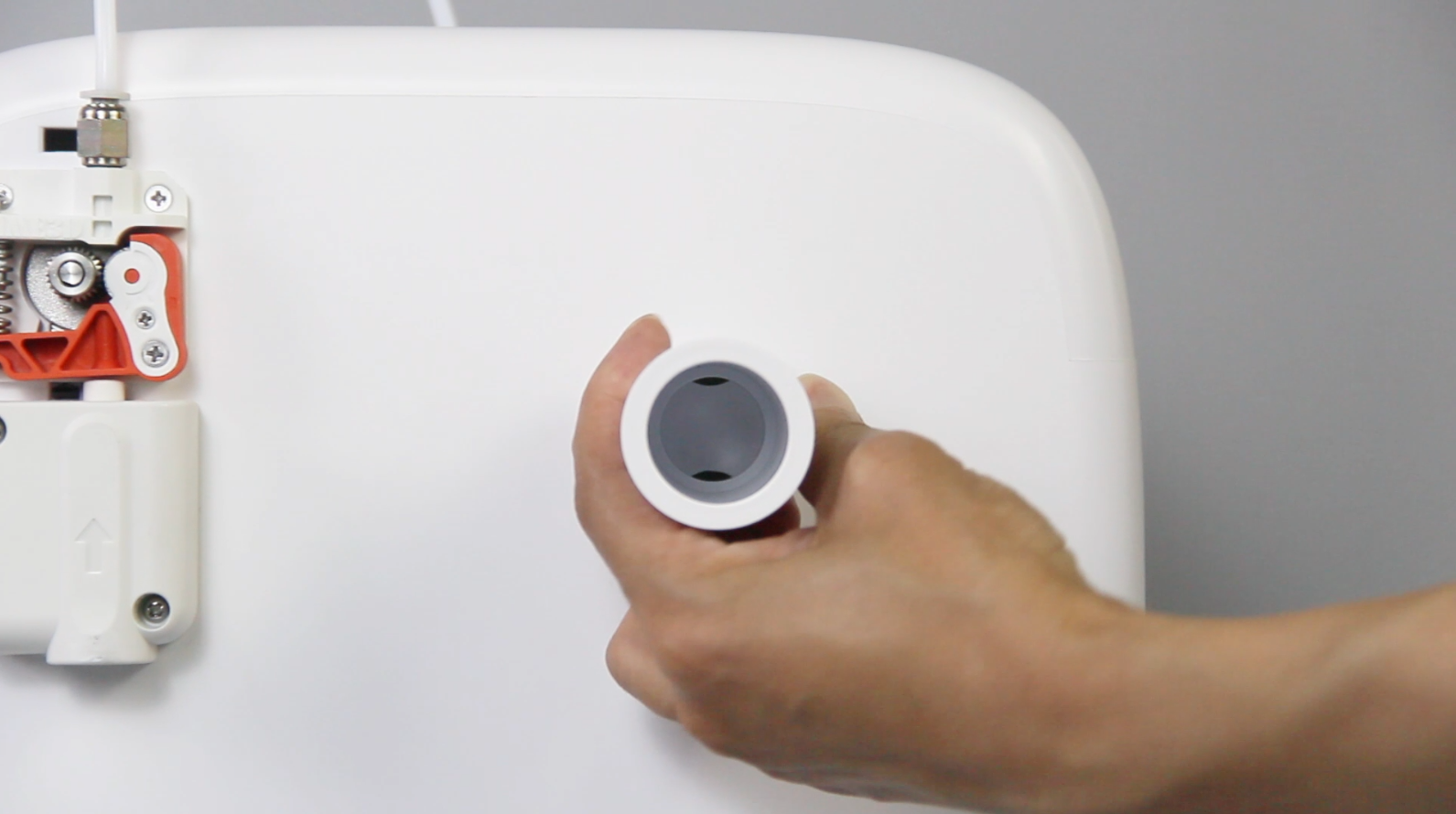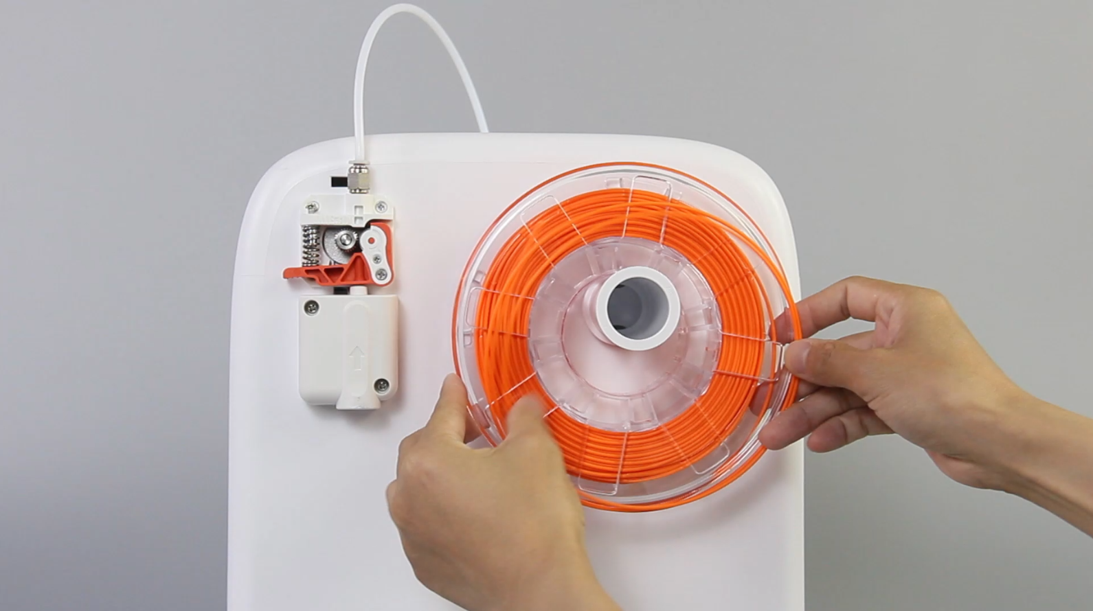 | 7. Place the base plate along the edge of the bed. | 8. Install the spool holder at the back of the printer. | 9. Unhook the filament from the spool and place the spool onto the holder. Ensure the tip of the filament is facing upward. |