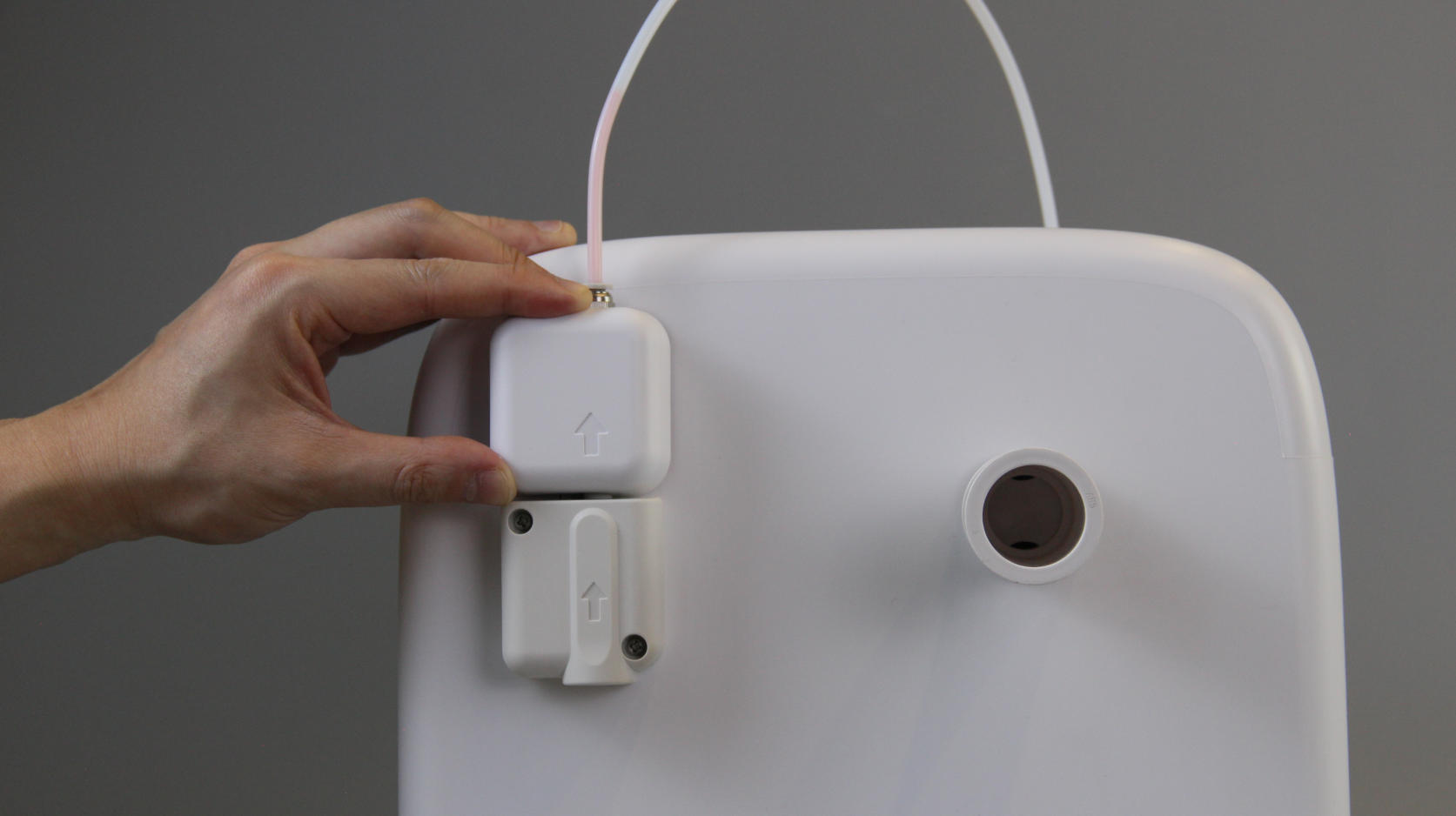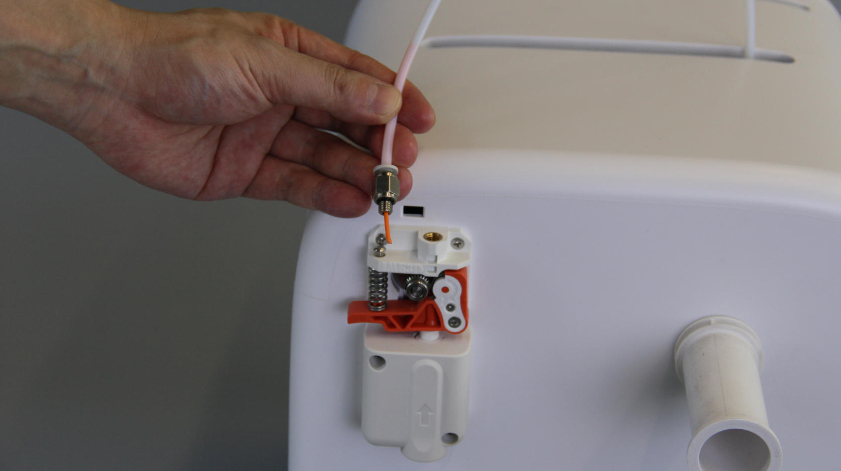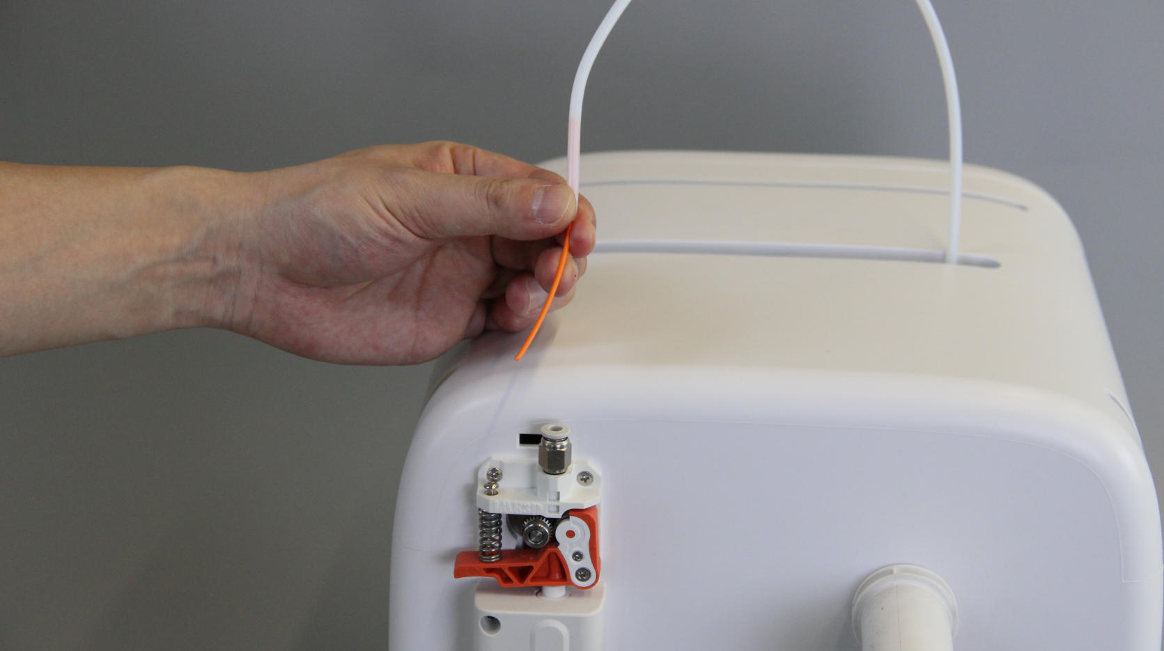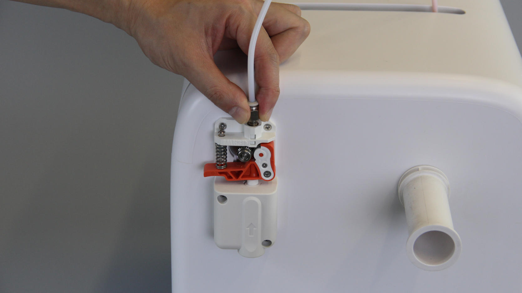 | 1. Switch off the printer. Remove the filament spool and the extruder cover. | 2. Press on the extruder's pneumatic fitting and press the spring ring all the way down with one hand. | 3. Grasp the tube with the other hand. |