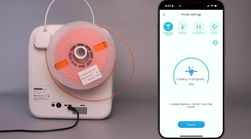 | 1. Start by unloading filament. Turn on the X-MAKER JOY AI + and connect it to your phone app. | 2. After unloading is complete, turn off the printer and wait for the nozzle to cool down. | 3. Open the printer’s door, and you can see an orange button on the right of the print head. |