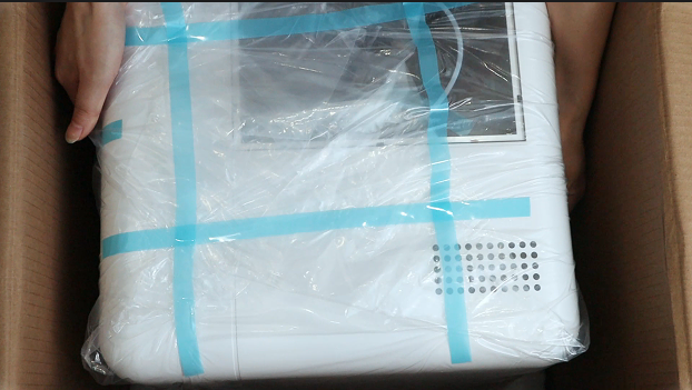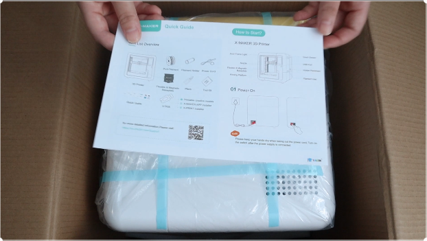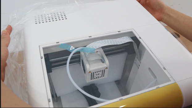 | 4.取出打印机(可直接拎起塑料袋)。 | 5.打印机耗材和配件放置在底部泡沫,注意取出。 | 6.去除外部塑料袋和固定带。 |