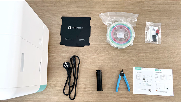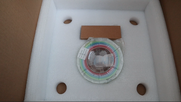 | 7.打开舱门,去除内部填充泡沫。电源线和耗材架固定在泡沫上。 | 8.检查配件:柔性平台、200g耗材、工具袋(内含U盘、通针和调平卡)、电源线、耗材架、斜口钳、快速指导页。 |