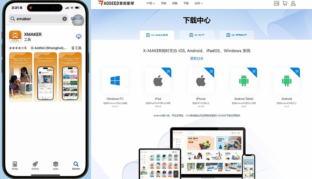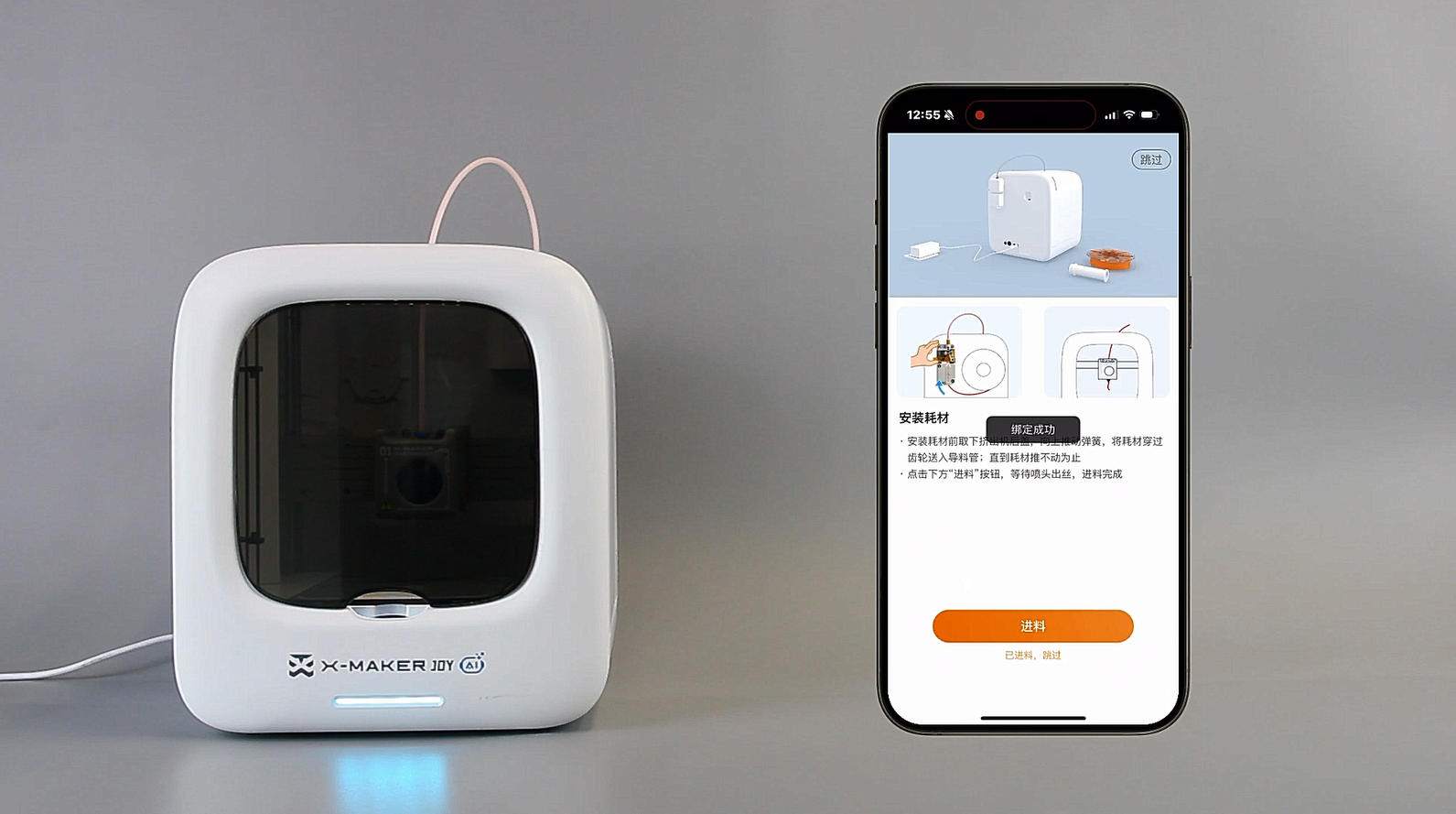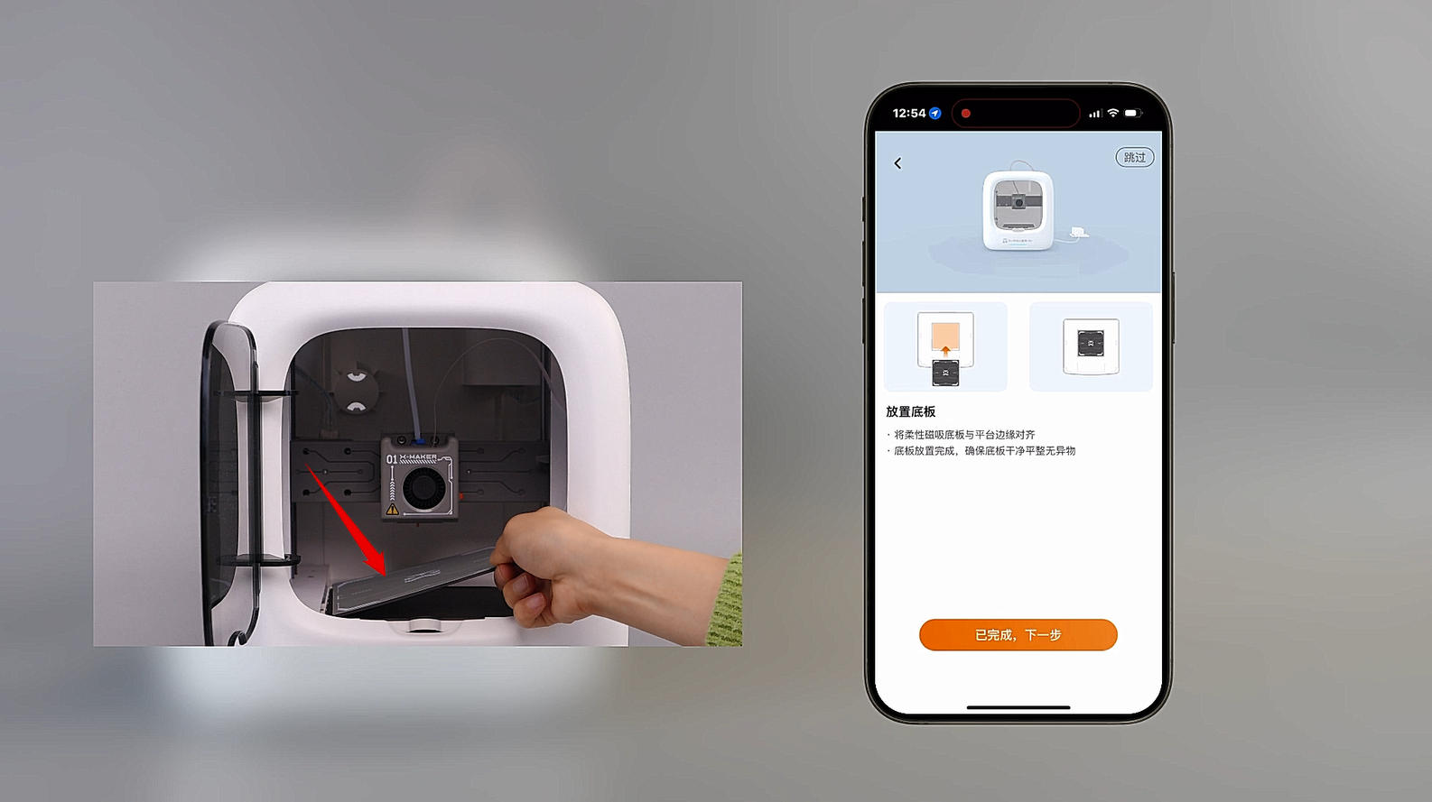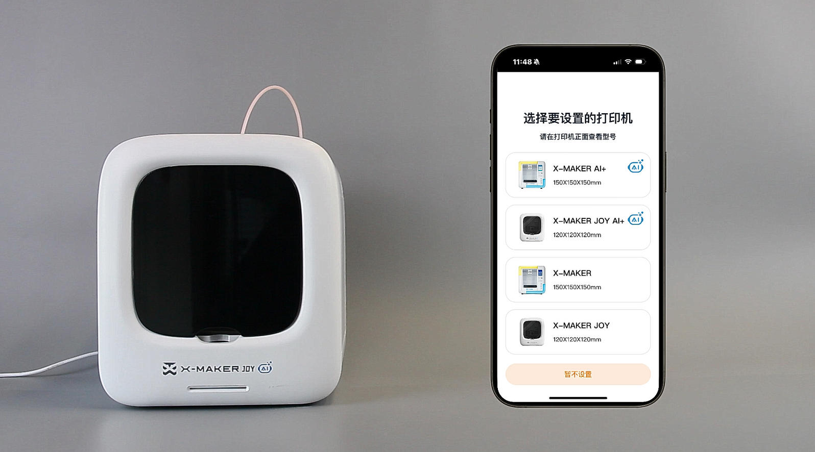 1. 在应用商店或官网下载X-MAKER APP,注意手机端下载X-MAKER;平板端下载X-MAKER HD。 | 2. 打开APP,在引导页选择X-MAKER JOY AI+打印机。 | 3. 第一步提示放置底板,在配置打印机时我们已经放置,点击“已完成,下一步”。 |